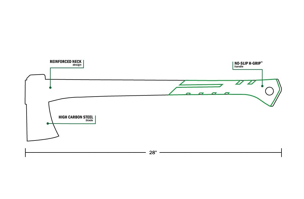 Splitting wood for your woodpile has never been easier with the Hooyman Splitting Axe, featuring 1065 high carbon steel and a signature green ergonomic, NO-SLIP H-GRIP handle. The steel blade features a V-Grind, making a stronger, thicker blade edge that will stay sharper longer and withstand repeated impact. Chop after chop; the reinforced fiberglass neck remains the strongest on the market. Easily store using the convenient peg hole and included protective sheath.
