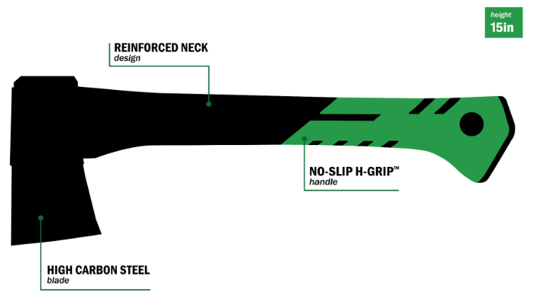 The Hooyman Small Hatchet is small but mighty, featuring 1065 high carbon steel and a signature green ergonomic, NO-SLIP H-GRIP handle. The steel blade features a V-Grind, making a stronger, thicker blade edge that will stay sharper longer and withstand repeated impact. What the neck of this hatchet lacks in size, it more than makes up for in strength, made of reinforced fiberglass, making it the strongest neck on the market. With a modern aesthetic design and a peg hole for easily hanging on your tool shed wall, the Small Hatchet is a must-have for every outdoorsman. When you want to take it with you into the field, just slide it into an included protective sheath for safe transport and easy storage.