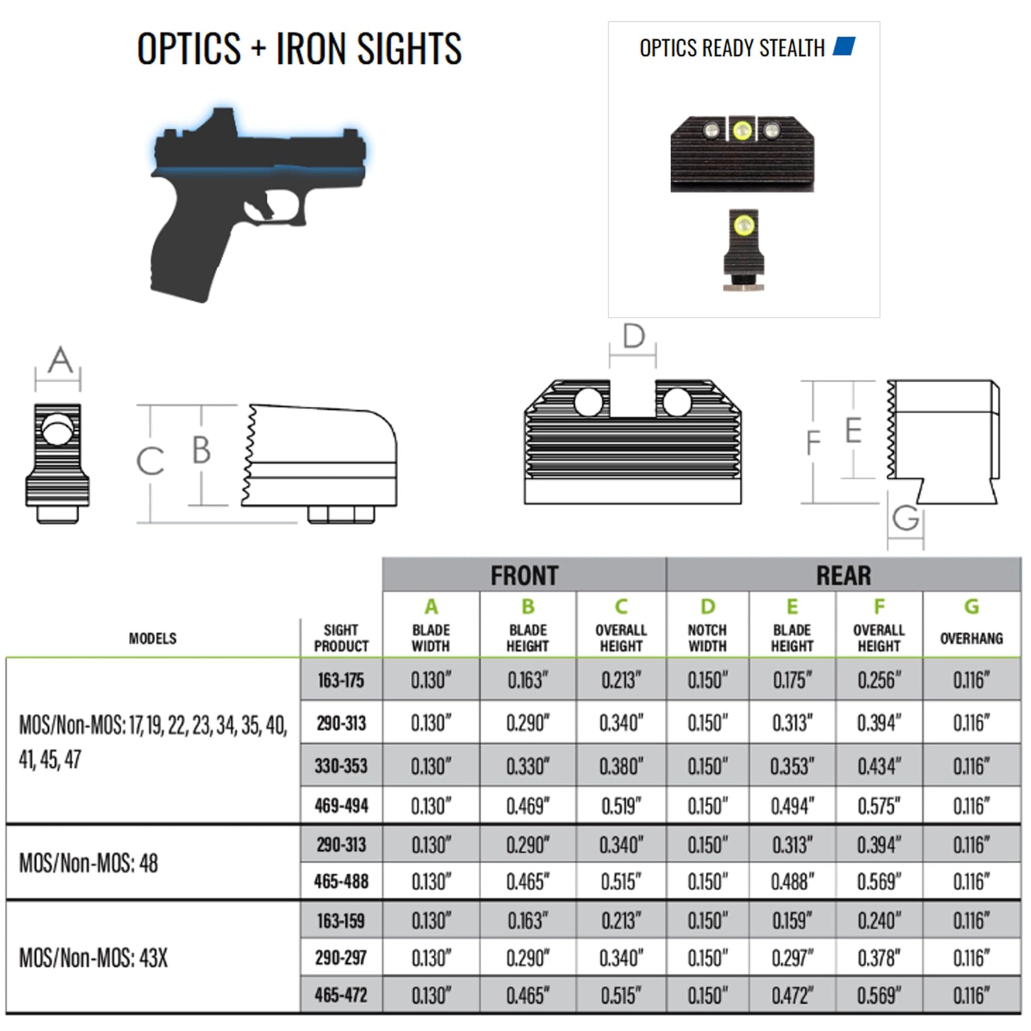 - COMPATIBILITY: These night sights are designed to be compatible with Glock 43/43X/43X MOS guns and engineered for an approximate lower 1/3 co-witness with popular optics such as Shield RMRcc or similar battery pack height optic using a plate mounted system