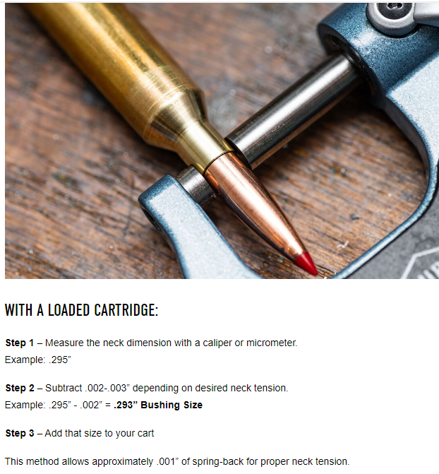 Proper neck bushing size can be determined two ways. RCBS suggests that reloaders get their determined size as well as the sizes .001-inches above and below their determined size.